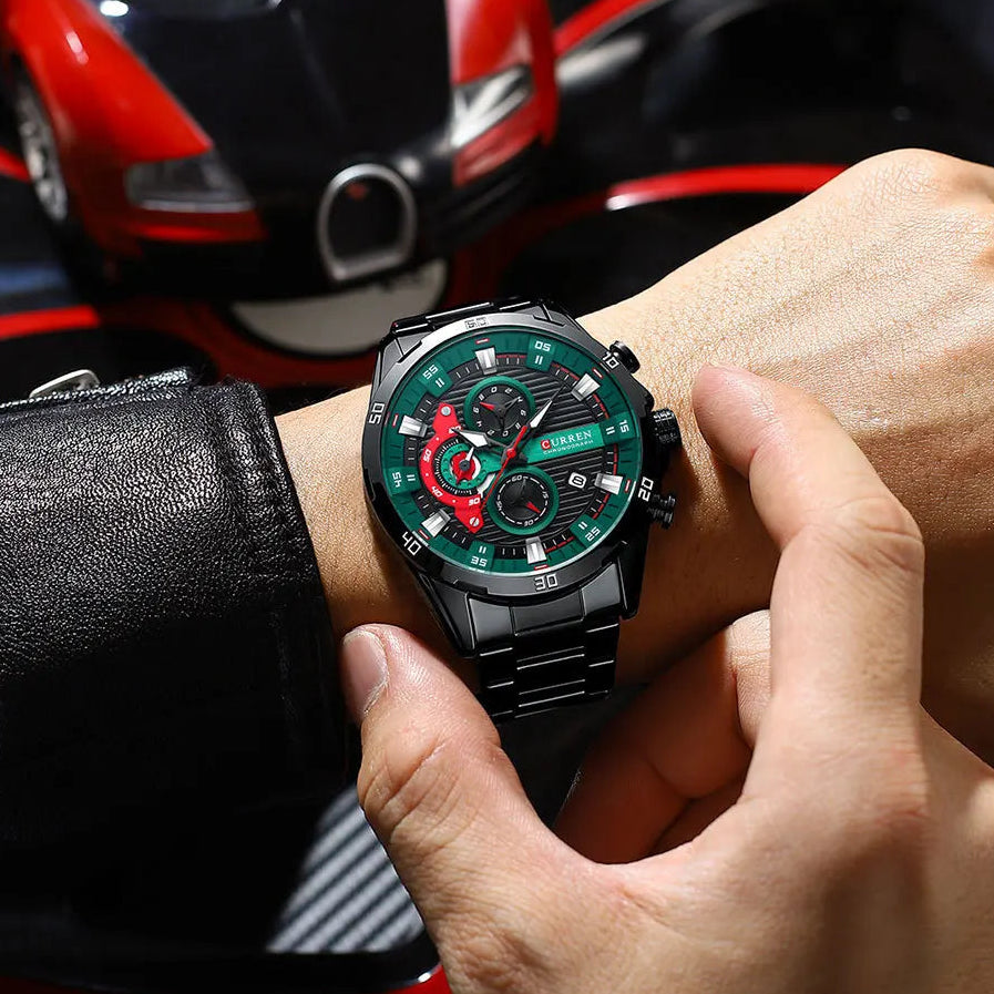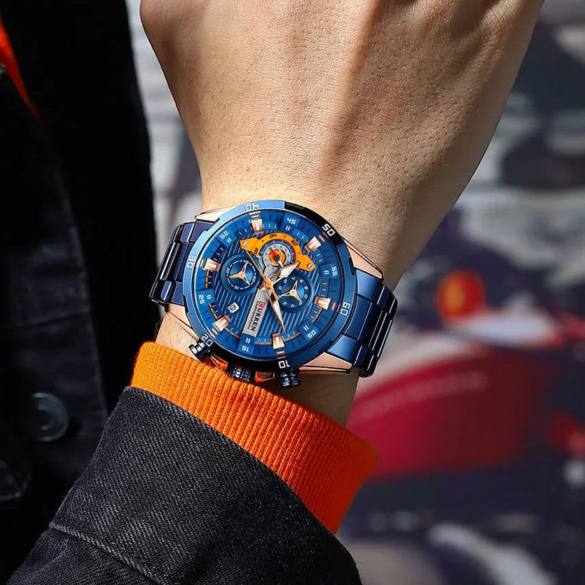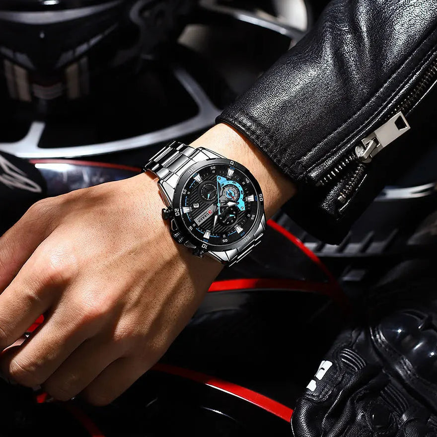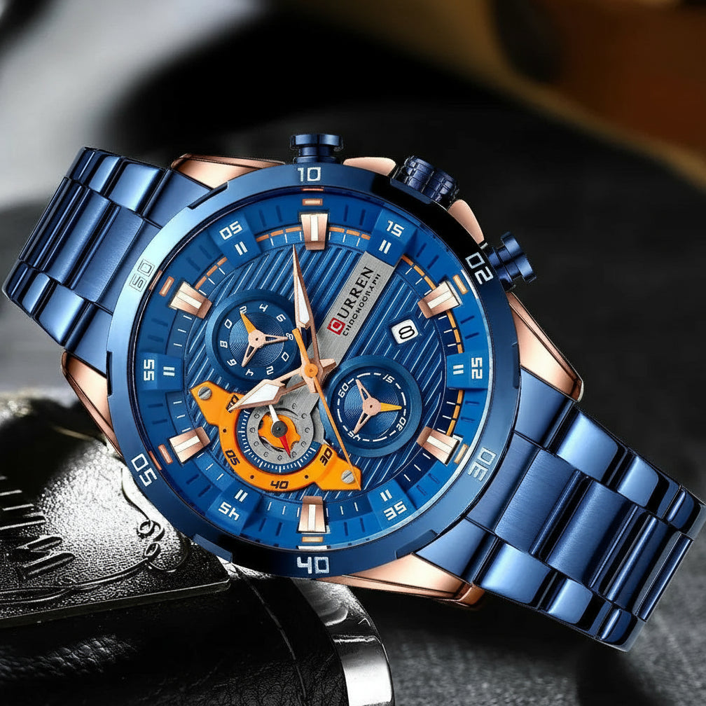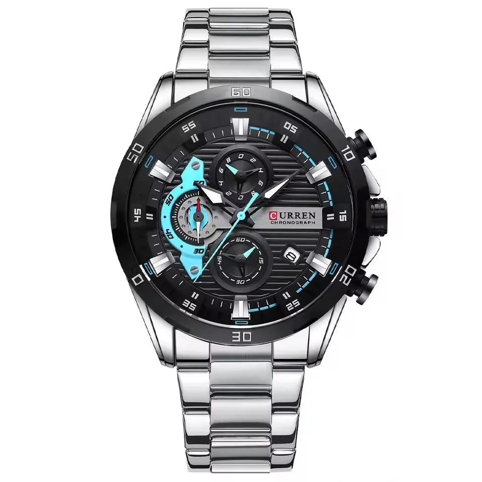 שעון גברים יוקרתי בעיצוב מודרני ומרשים עם מראה אלגנטי וייחודי. מנגנון קוורץ איכותי מתוצרת יפן, בעל פונקציית כרונוגרף מלאה.