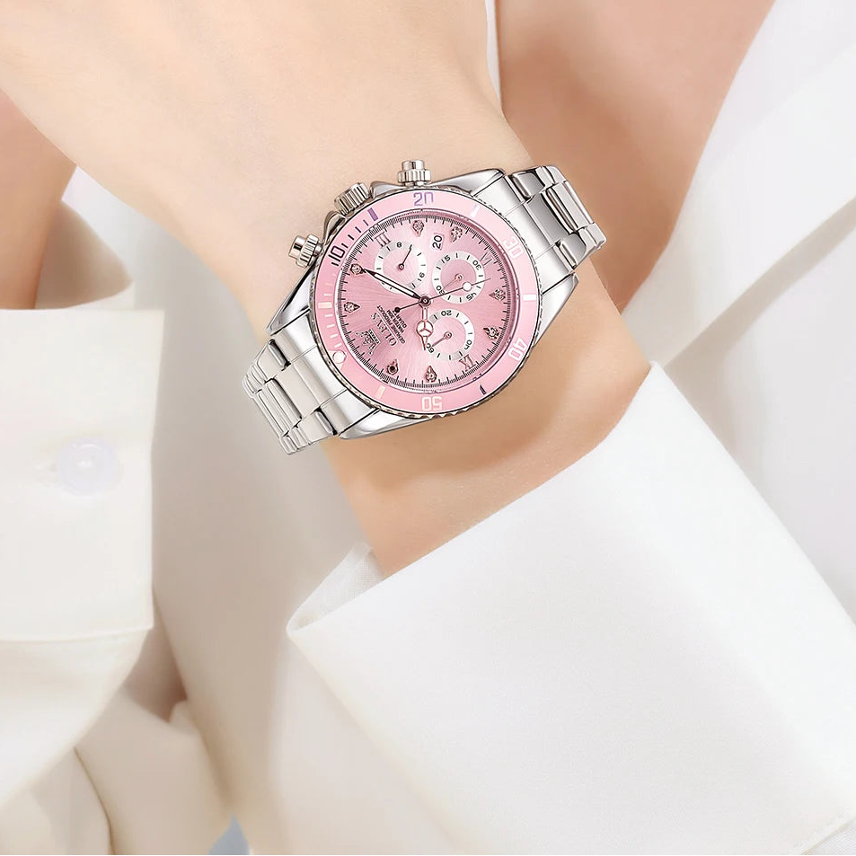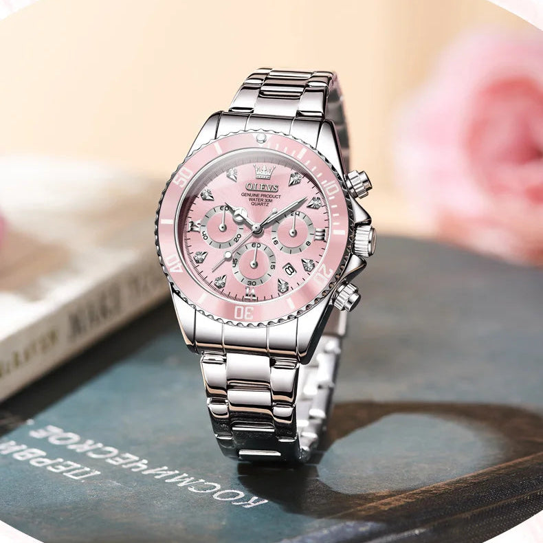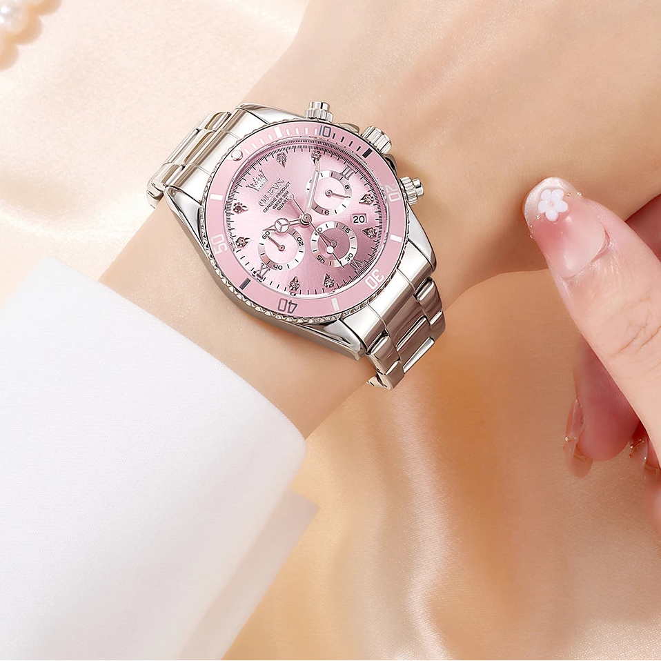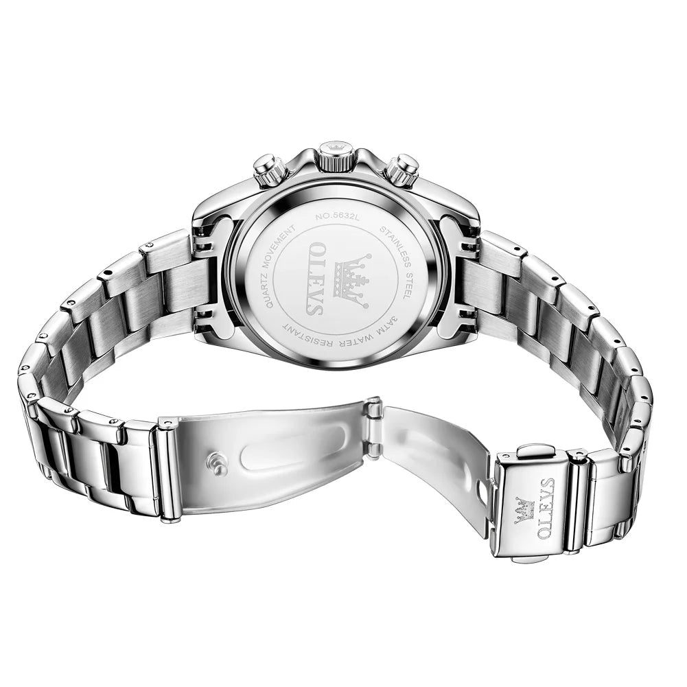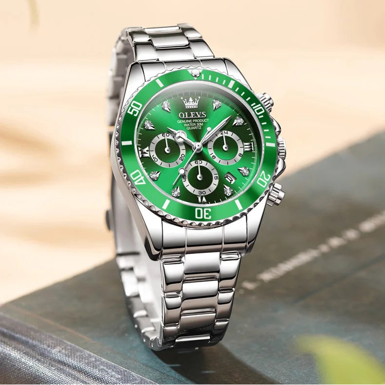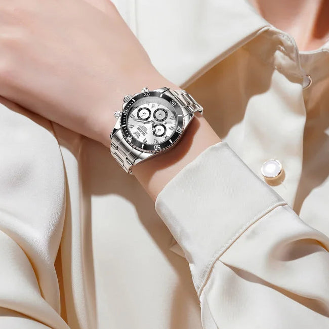 מנגנון קוורץ מדויק עם תצוגת תאריך אוטומטית וכרונוגרף מלא.